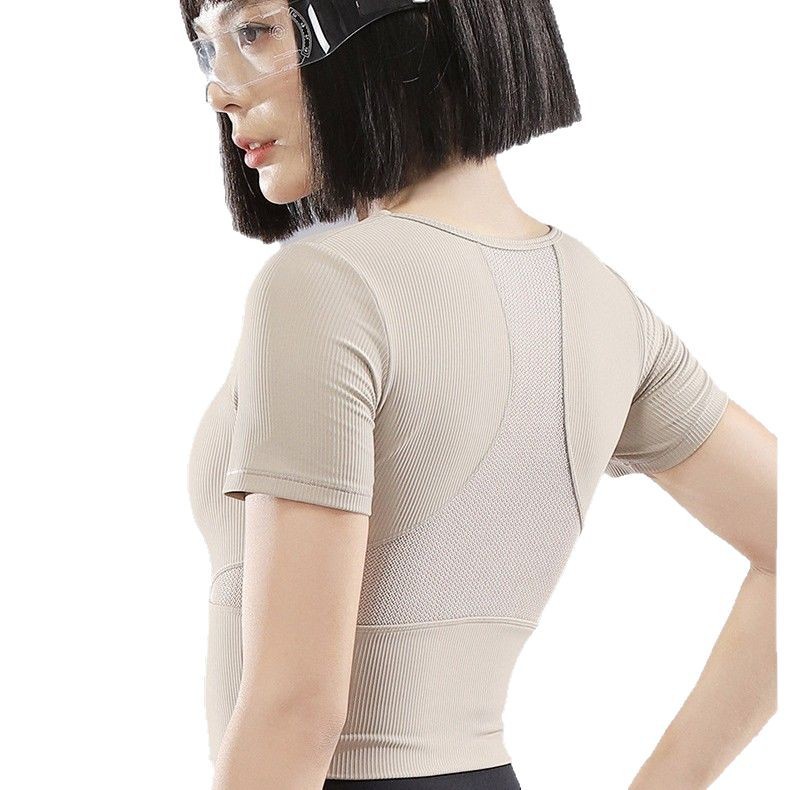 Yoga clothes with chest pad for women in summer Pilates training fitness tops with high-grade round neck and breathable sports short sleeves