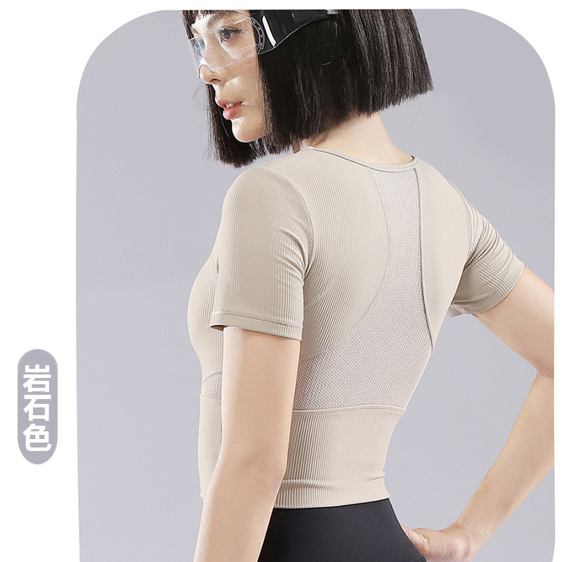 The key design feature is a large mesh panel on the back, which significantly enhances ventilation during workouts. The top features a tight-fitting silhouette, short sleeves, and a cropped (chest-length) cut.